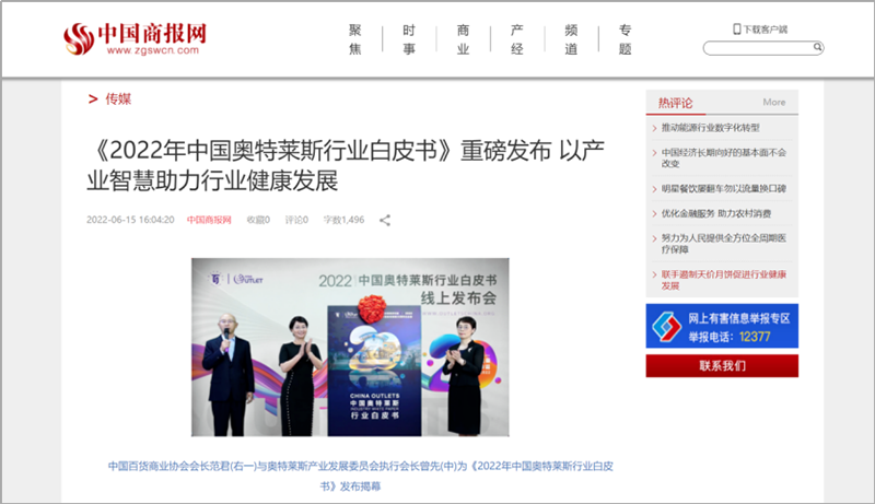 2022年6月15日,中國(guó)百貨商業(yè)協(xié)會(huì)奧特萊斯產(chǎn)業(yè)發(fā)展委員會(huì)線上直播發(fā)布《2022年中國(guó)奧特萊斯行業(yè)白皮書》。白皮書中“2021年中國(guó)零售市場(chǎng)最新發(fā)展、中國(guó)奧萊20年全覽、2021年中國(guó)奧萊市場(chǎng)發(fā)展、中國(guó)奧萊展望和政策建議、專家訪談”等內(nèi)容吸引政府領(lǐng)導(dǎo)、專業(yè)機(jī)構(gòu)、產(chǎn)業(yè)運(yùn)營(yíng)商、品牌商、服務(wù)商、媒體記者及眾多奧萊消費(fèi)者共計(jì)20余萬人參會(huì),成為國(guó)內(nèi)奧萊行業(yè)年度一大焦點(diǎn)。