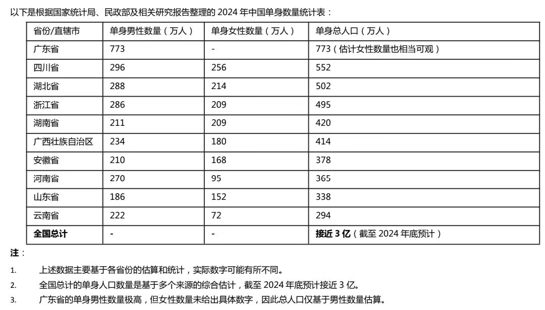根據(jù)國家統(tǒng)計局和《中國人口和就業(yè)統(tǒng)計年鑒》的相關(guān)報告,2022到2023年期間,中國單身人口數(shù)量已經(jīng)達到2.4億,并且根據(jù)推測,2024年單身人口將達到3億,這就意味著每四個中國人中就有一個單身。